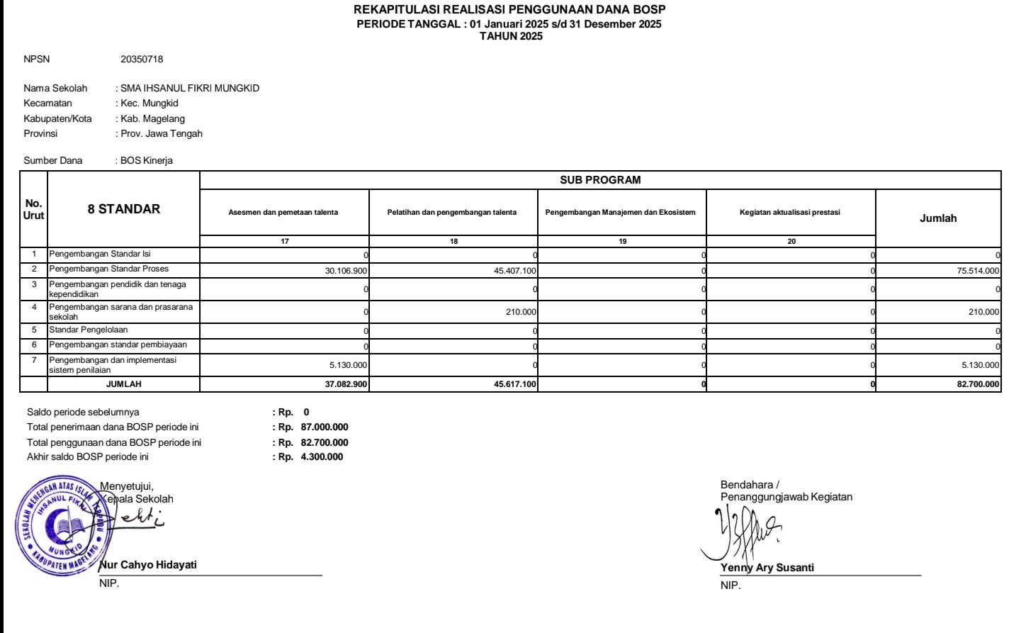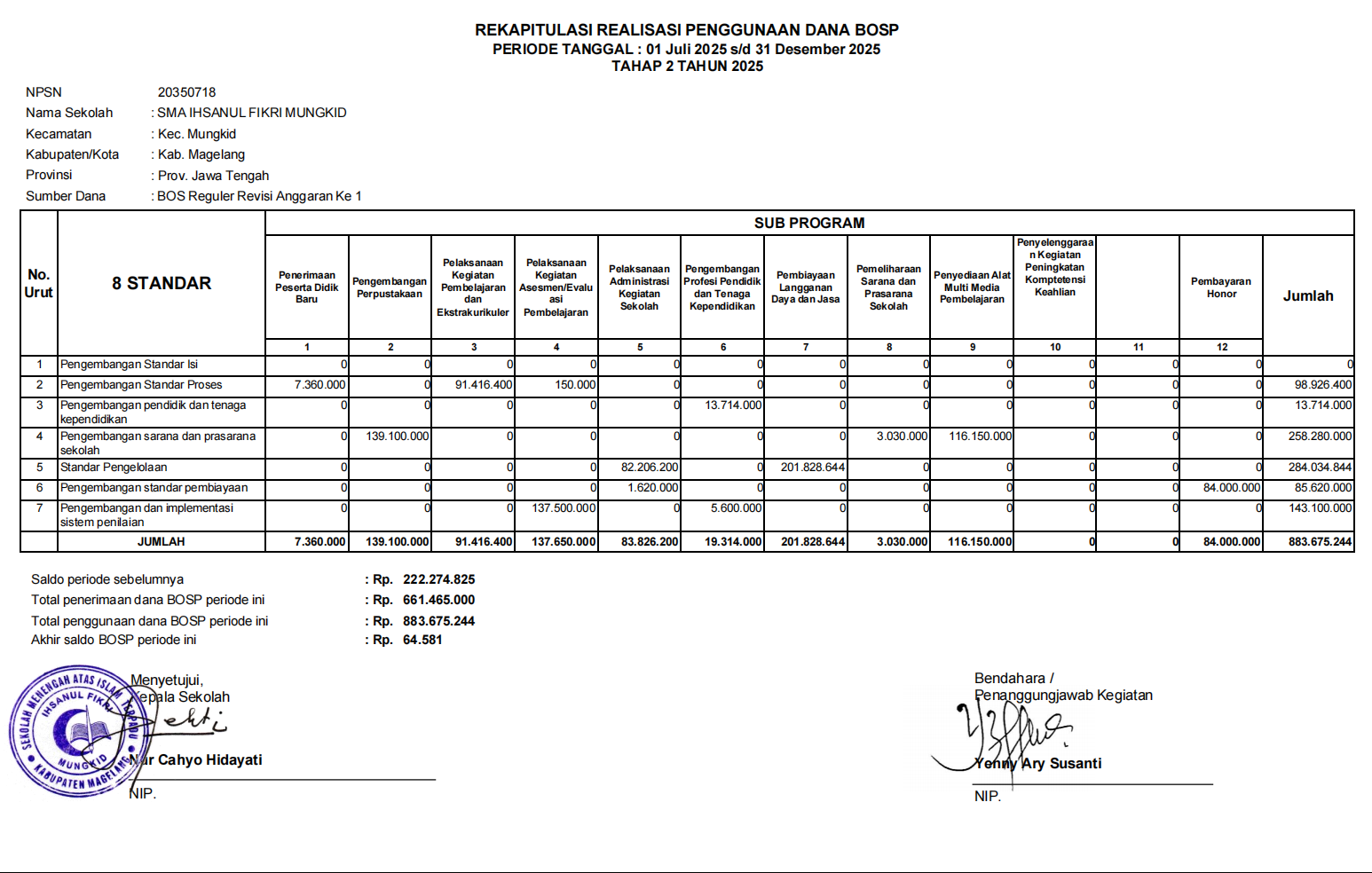 Rekapitulasi Realisasi Penggunaan Dana BOSP Tahap 2 Tahun 2025 (1 Juli sd 31 Desember 2025)